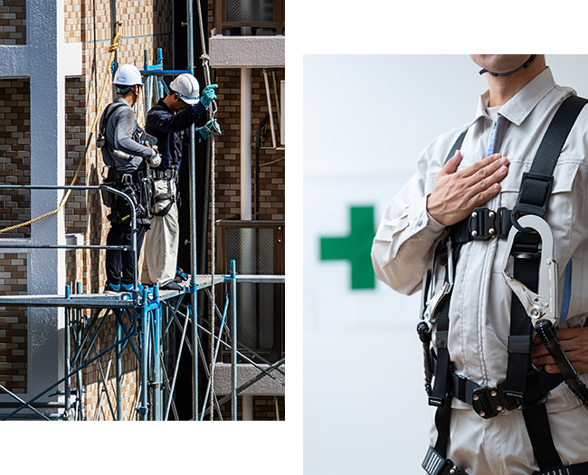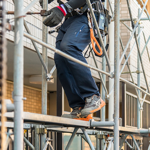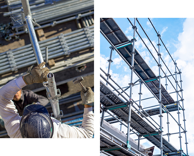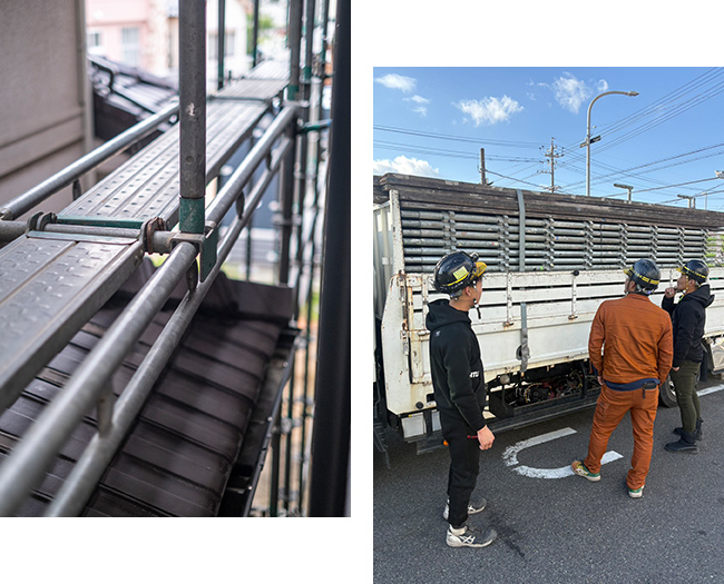 私たちが行うのは、住宅・マンション・工場・プラントなどの建設や改修現場で、職人が安全に作業を行うための足場を組立・解体する仕事です。