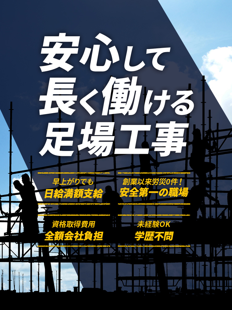 | 仕事内容 | ■建設現場における足場の組立・解体作業 小規模現場から大型案件まで経験できるため、技術の幅が広がります。 |